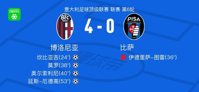 北京时间10月5日,意大利足球顶级联赛第6轮,博洛尼亚坐镇主场迎战比萨。比赛开始后,博洛尼亚率先打破僵局,达林加送出助攻,坎比亚吉推射破门,为主队取得领先。随后,比萨球员伊德里萨-图雷因犯规被直接红牌罚下,客队被迫以少人应战。人数占优的博洛尼亚持续施压,莫罗抓住机会再下一城,进一步扩大比分。临近上半场结束,坎比亚吉边路突破后传中,奥尔索利尼包抄破门,将优势延续至下半场。易边再战,博洛尼亚依旧掌控节奏,达林加再次建功,助攻延斯-厄德高冷静施射得手,锁定胜局。最终,博洛尼亚以4比0完胜比萨,全取三分。