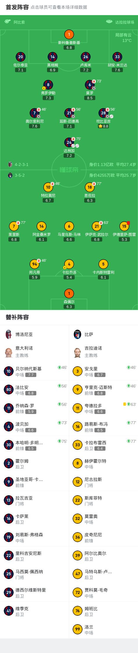 博洛尼亚4-0大胜比萨, 延斯-厄德高建功,奥尔索利尼破门