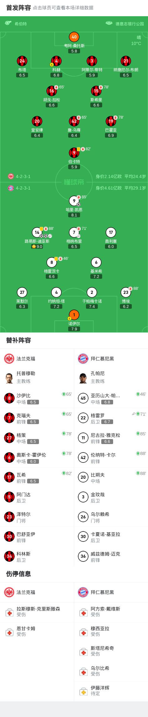北京时间10月5日0:30,德甲第6轮继续进行,拜仁慕尼黑作客德意志银行公园球场挑战法兰克福,本场主裁判为希伯特。上半场,路易斯-迪亚斯开场闪电破门,随后又助攻凯恩远射直窜死角。下半场,路易斯-迪亚斯凭借个人能力再下一城梅开二度。最终,拜仁3-0客胜法兰克福。