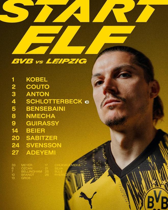 多特蒙德首发:1-科贝尔、3-安东、4-施洛特贝克、5-本塞拜尼、2-扬-科托、20-萨比策、8-费利克斯-恩梅加、24-丹尼尔-斯文松、14-拜尔、27-阿德耶米、9-吉拉西