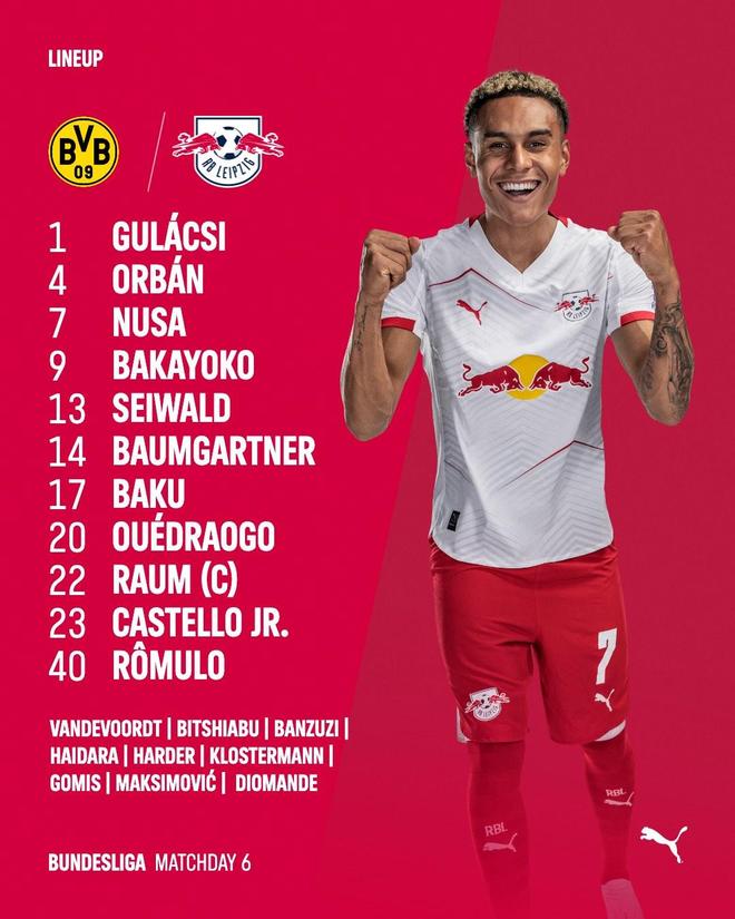RB莱比锡首发:1-古拉西奇、22-劳姆、23-卢克巴、4-威利-奥尔班、17-巴库、13-赛瓦尔德、14-鲍姆加特纳、20-阿桑-韦德拉奥果、7-努萨、9-若昂-巴卡约科、40-罗慕洛